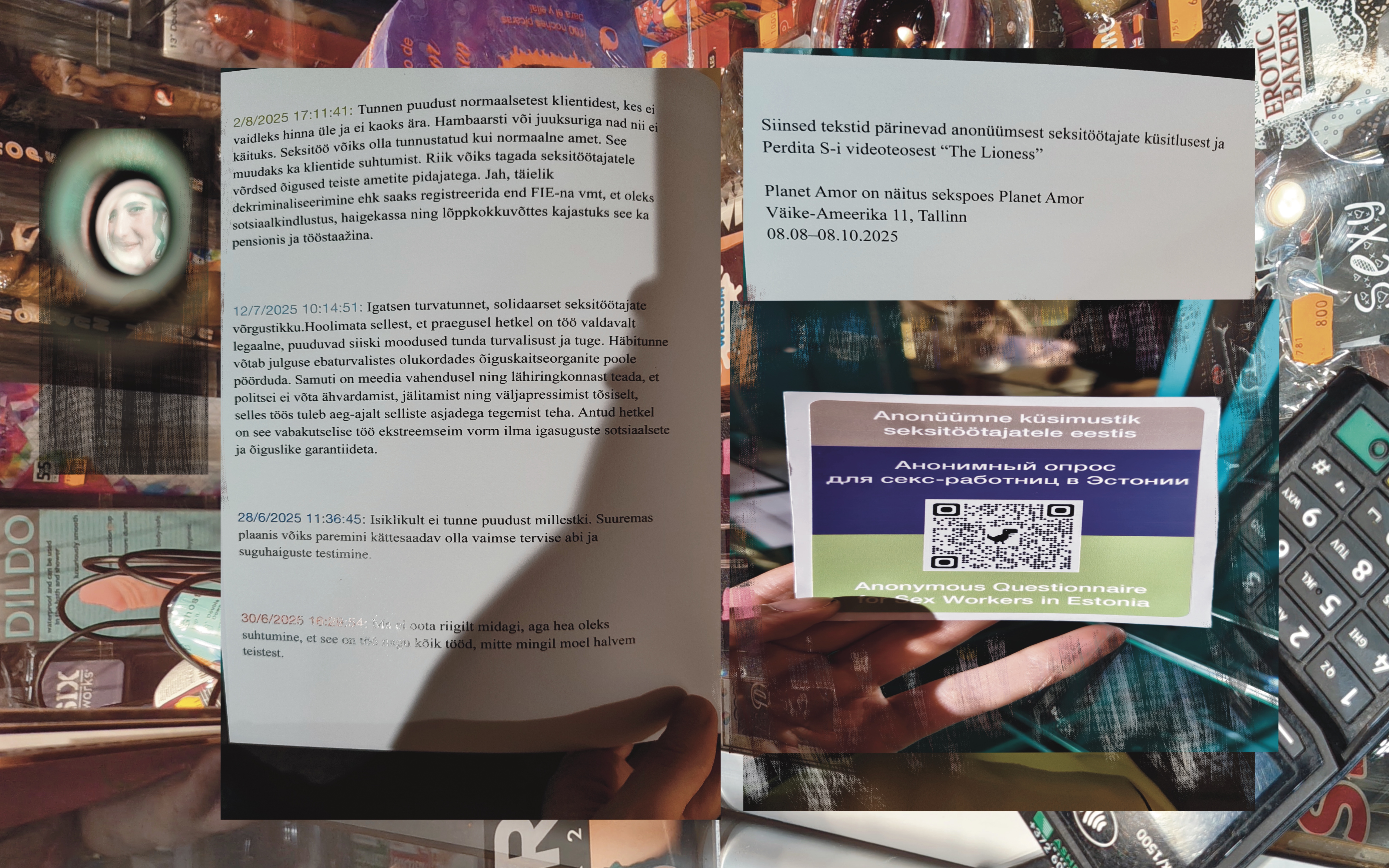 Planet AmorPerdita S, Pire Sova, Aet KuusikSex shop Planet Amor, Tallinn 2025 Planet Amor is an exhibition about female sexual agency, intimacy, and the power to set boundaries in a world that often expects quiet compliance. It doesn’t speak of sin or redemption, but of choices – personal, complex, and sincere. It speaks of people whose bodies and affection do not automatically belong to anyone. The works of the two artists connect personal experience with social critique, questioning the norms that define whose sexuality is visible and accepted, and whose is not. What would change if the right to decide over one's body and desires were not overshadowed by shame, the threat of violence, or poverty? In the works of Perdita S., the artist who has been a sex worker for 10 years, steps into the role of the client for the first time. She hires a sex worker to pose for her drawings. Although the drawings portray a nude sex worker, they also show the artist’s relationship to looking, choice, and closeness. In the drawings, made with makeup products, the model wears an accessory of her own choosing. The muse is not a passive source of inspiration here, but a collaborator: she is compensated for her work and co-creates the artwork. In this case, who chooses the perspective and who leads the process? In the video piece “The Lioness”, the artist reflects on her experience after hiring the sex worker. For Perdita S., drawing can feel more intimate than sex, which can often be quite impersonal – while drawing someone can create profound intimacy. The text in the video is read by a professional camgirl, whom the artist hired and paid according to her usual rate. Pire Sova’s work "The First Class Order of the Whore of Terra Mariana" and the installation "Intimacy Shop" explore female sexual agency within social and political contexts. The order is an honor to all those who resist whorephobia and help normalize sexual agency. The names of Estonia’s national honors often reference Christian values, and the patriarchal values that come with them – this work questions whom our society values and whose labor remains invisible. The badge of the order can be purchased for oneself or as a gift for someone who deserves such recognition. The silk badge features a piece of amber with an insect trapped inside. Amber is also considered the world's oldest gemstone. Nine badges are available for sale. "Intimacy Shop" approaches intimacy from the perspective of intimacy as a commodity. Sexual capital, erotic capital, and emotional labor – everything can be commodified, and this also happens outside the context of sex work. The artist asks why a woman’s – or anyone’s – affection should be freely available and taken for granted? The providing of intimacy can be viewed from the perspective that it is effort and labor – even if the provider does it sincerely and enjoys it. Affection is valuable, it has a price, and no woman owes it simply because she is a woman. “Planet Amor” does not suggest that sex work is always liberating. But the exhibition asks, what would happen without whorephobia, if a woman could choose herself how to use her body and live her sexuality. If her sexual agency were not overshadowed by moral codes or economic pressure. A world where sexuality is not shameful, but part of subjectivity. Where a sex worker can be a muse, a collaborator, a creative individual — not someone spoken about, but someone who speaks for herself. The exhibition venue – the sex shop Planet Amor — is not a coincidence. In institutional art spaces, it is often the administrative staff and curators who receive stable income and social security – unlike many artists and sex workers, whose labour remains structurally unsupported. Economic pressure affects most people's decisions and raises questions about the limits of freedom. Choices made under such conditions, such as the choice to earn a living through sex work, are real choices. Considering that these realities affect both artists and sex workers, we decided to hold the exhibition outside the traditional art spaces – in the colorful and layered environment of a sex shop. A zine accompanies the exhibition, featuring anonymous responses from a questionnaire directed at sex workers Texts: Aet Kuusik |